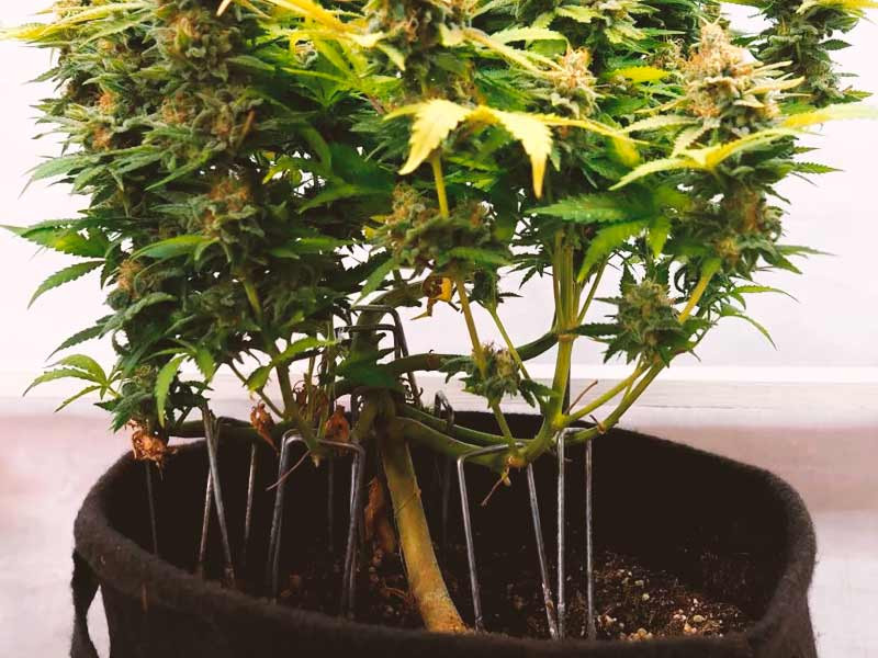 Наиболее популярным методом низкострессового тренинга (LST − Low Stress Training) является принудительное отведение и пригибание к земле стебля и ответвлений. В результате куст получается разлапистым, все побеги полноценно освещаются, урожайность повышается в разы. На данную технику следует обратить внимание гроверам, выращивающим быстро вытягивающиеся сорта каннабиса в условиях ограниченной площади.