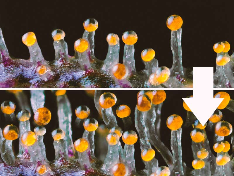 В период созревания шишек содержание терпенов и каннабиноидов в них изменяется. Важно собрать урожай в момент их наибольшей концентрации – когда половина трихом станет молочно-белой, а вторая половина, начинает приобретать янтарный оттенок.
