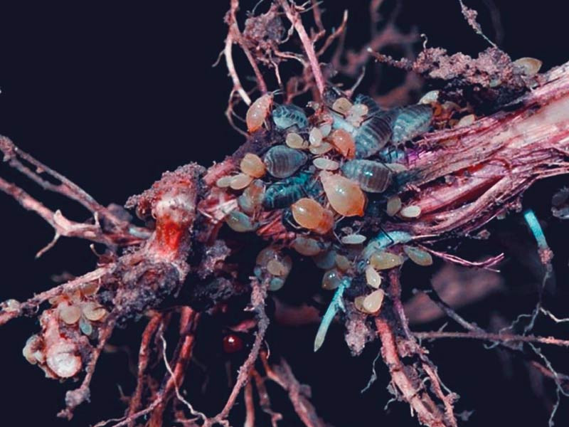 Однако механизм паразитирования и негативного воздействия несколько иной. Корни конопли, пораженной корневой тлей, приобретают желтый окрас и разбухают, а впоследствии твердеют и теряют способность противостоять инфекциям и нормально выполнять функции впитывания и обмена. В итоге появляются некротические зоны, очаги грибковых инфекций, что если не убивает куст полностью, то он перестает развиваться, остается низкорослым и неурожайным.